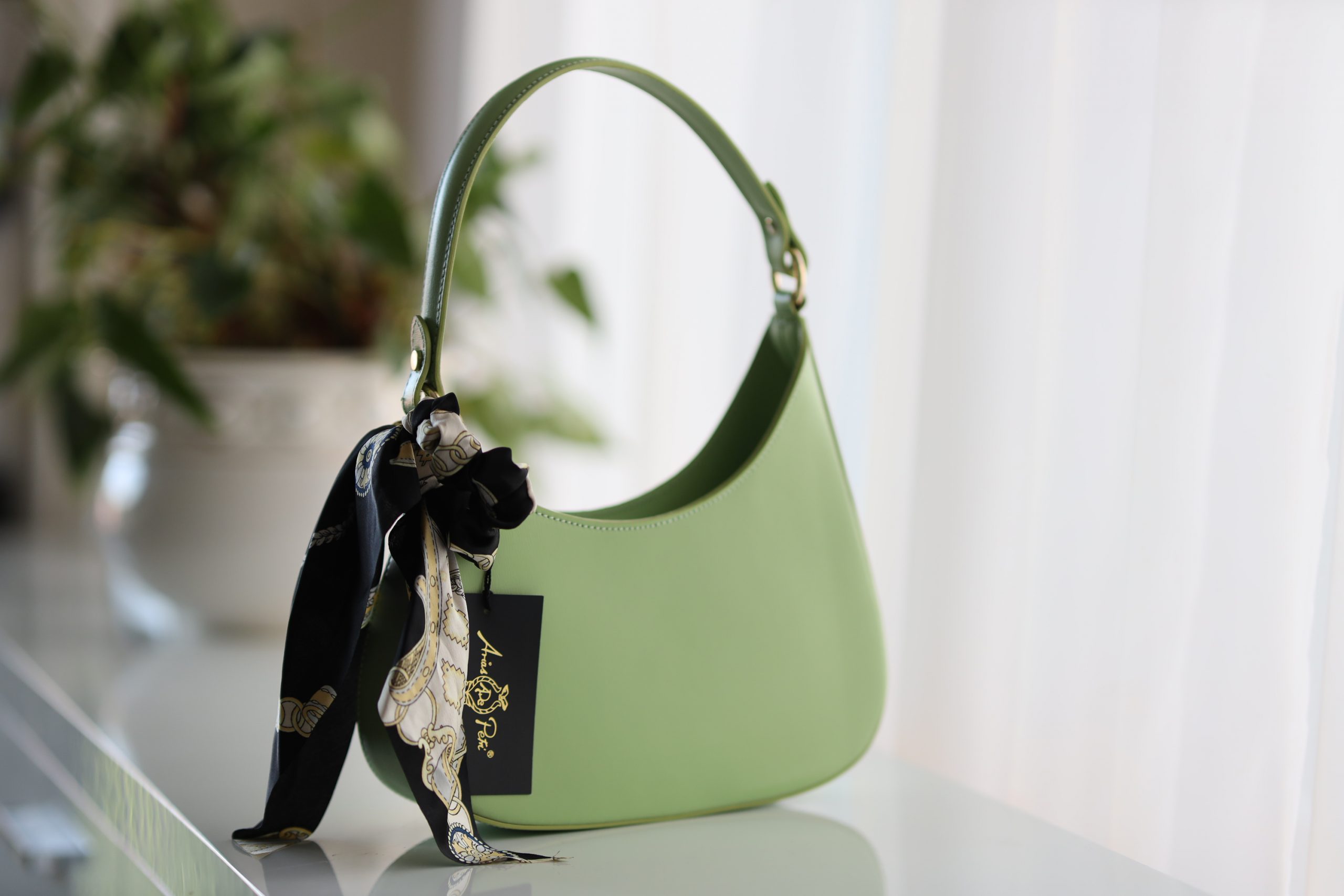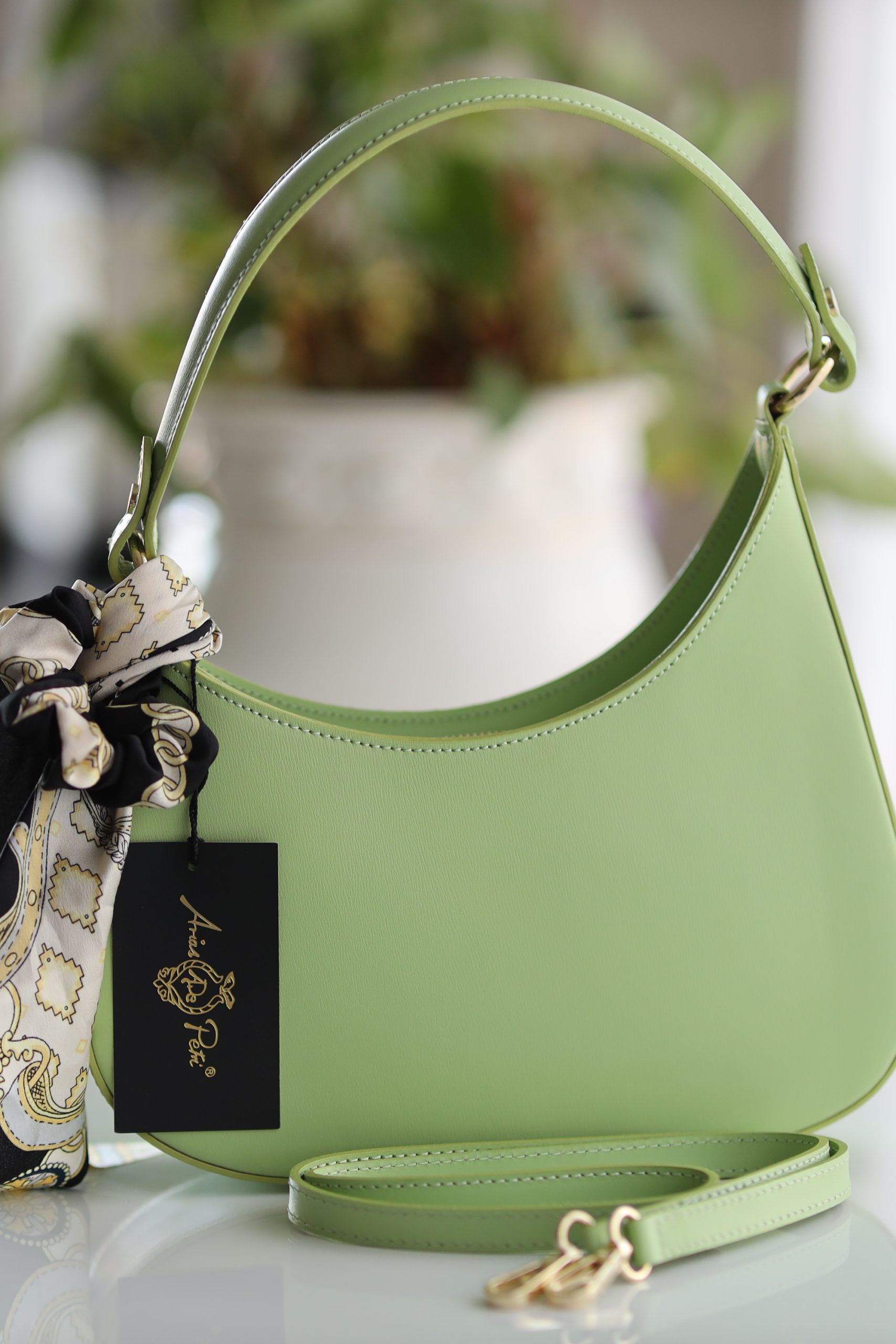 Elegante und trendige Damen Lederhandtasche in Mint Grün. Die Handtasche besticht durch die asymmetrische, stylische Form. Zudem gibt es ein passende Tuch mit dazu.