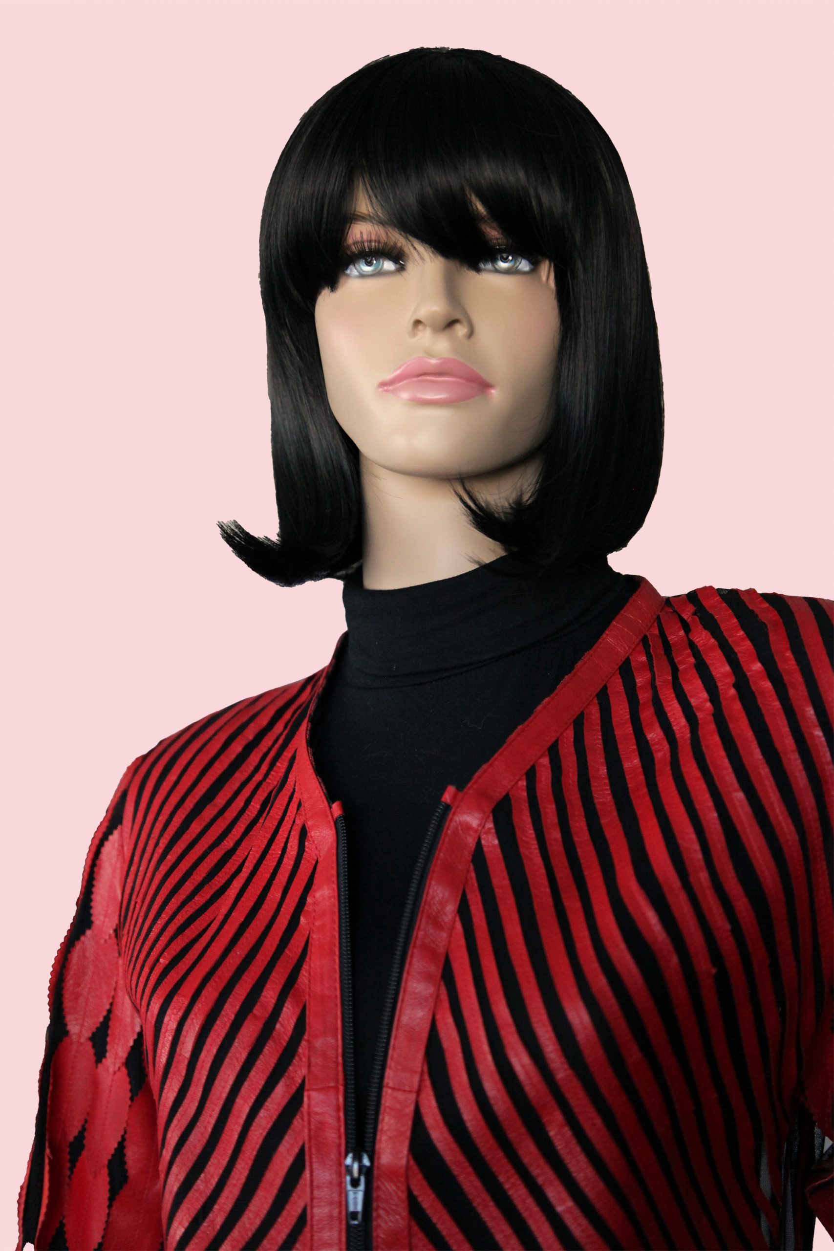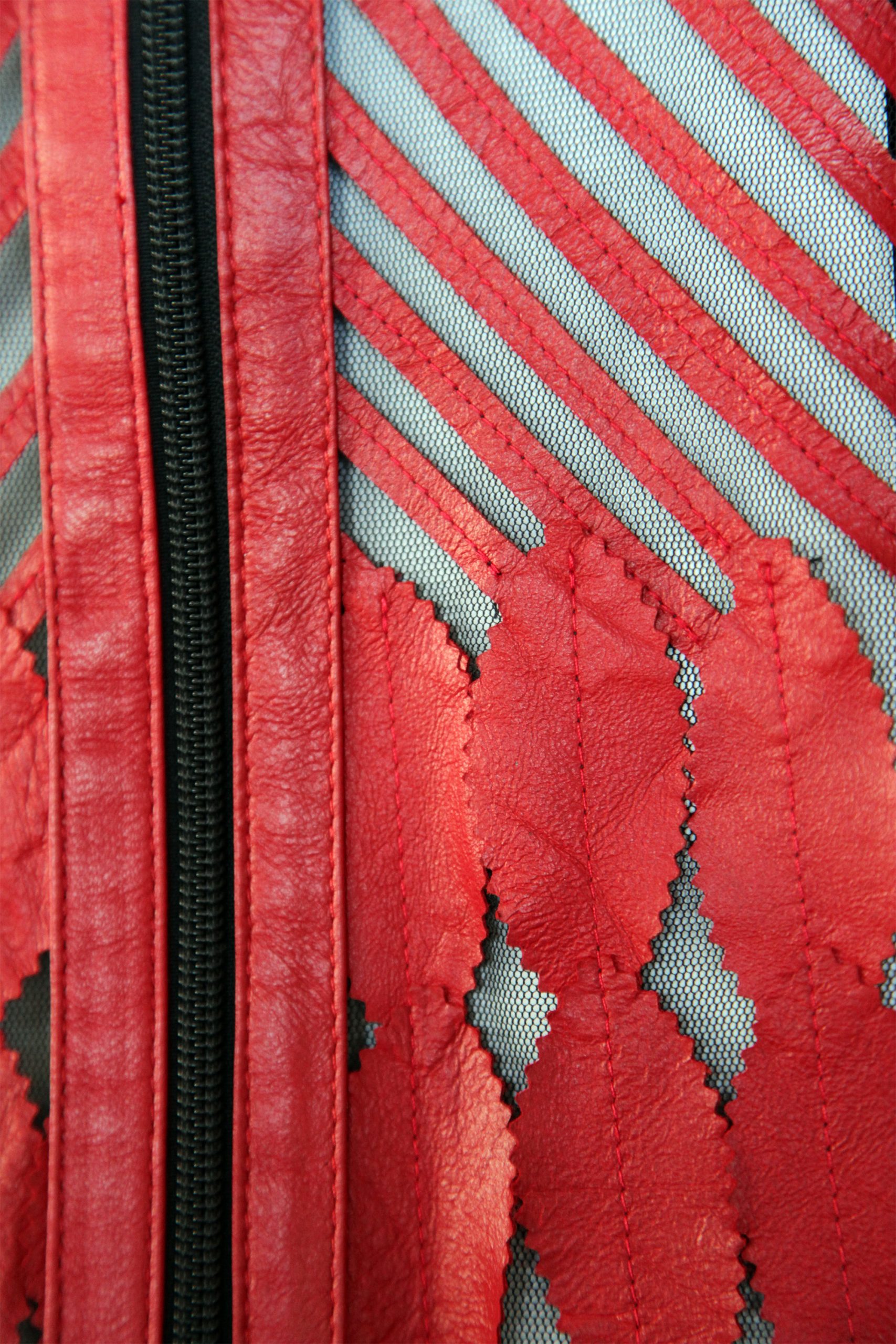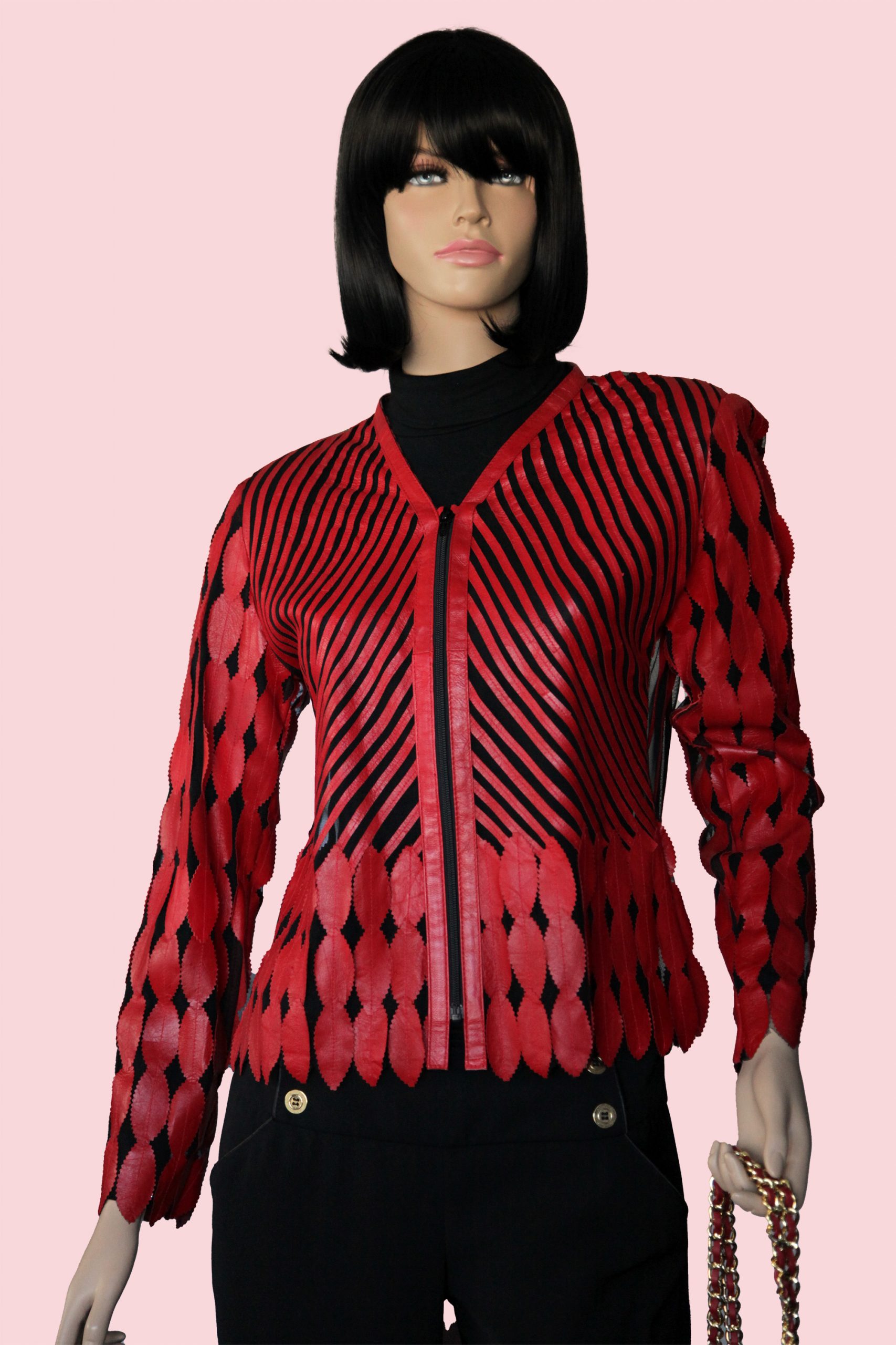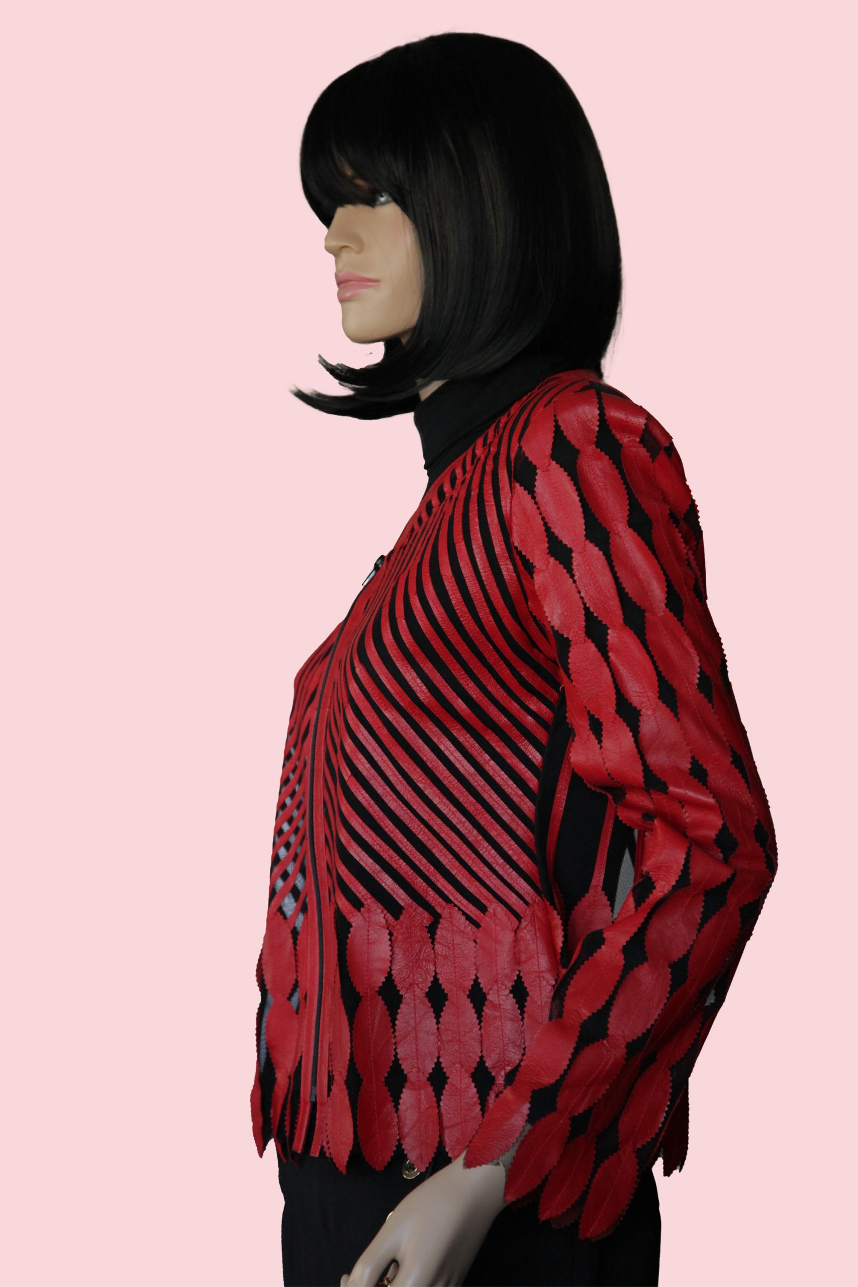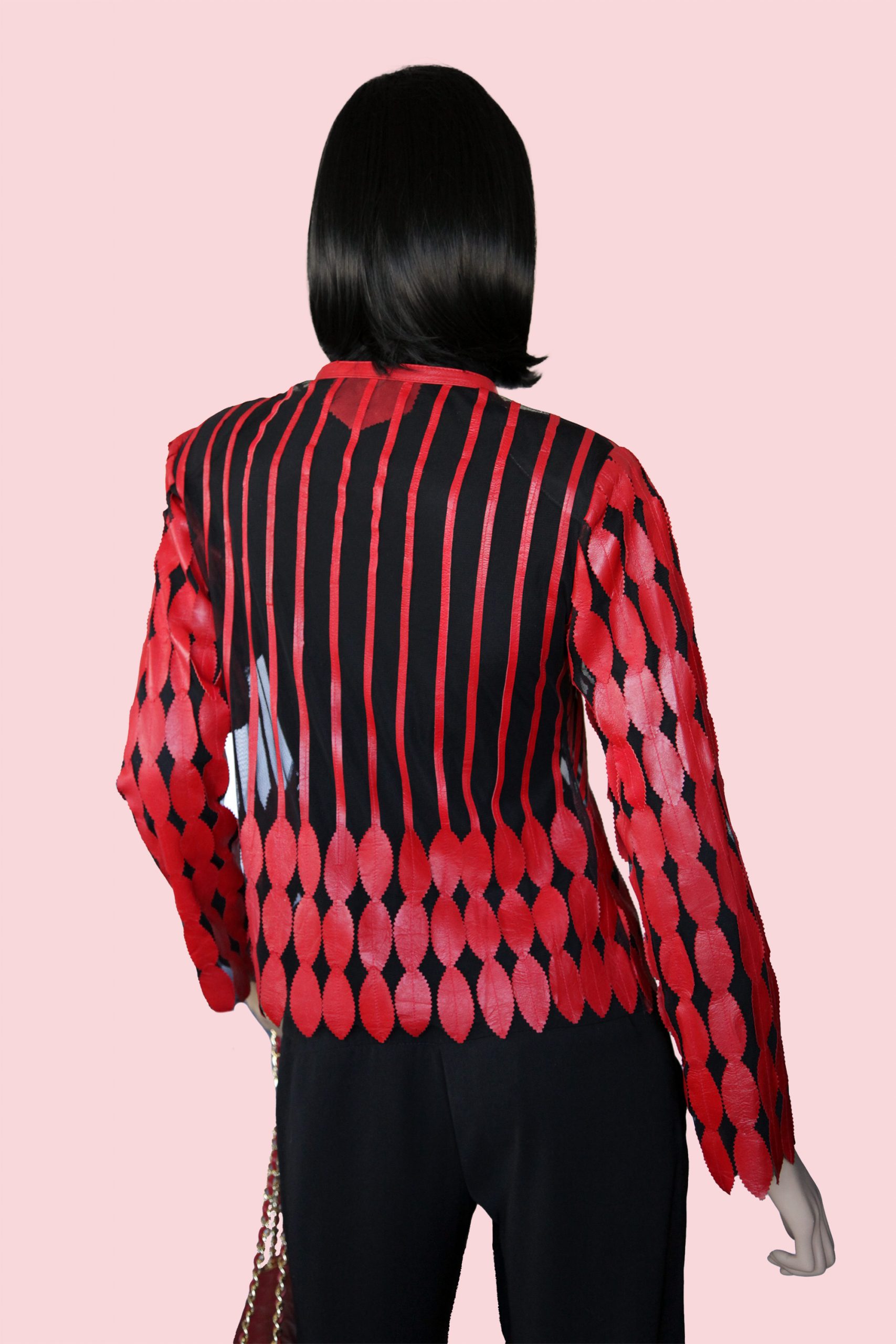 Die auffälligen roten Echtlederblätter im unteren Bereich und entlang der Ärmel verleihen der Jacke eine unvergleichliche Note. Die künstlerisch angeordneten Lederstreifen im oberen Bereich, die diagonal aufeinander zulaufen und auf einem eleganten schwarzen Tüllstoff aufgenäht sind, setzen einen Hauch von Raffinesse und Modernität.