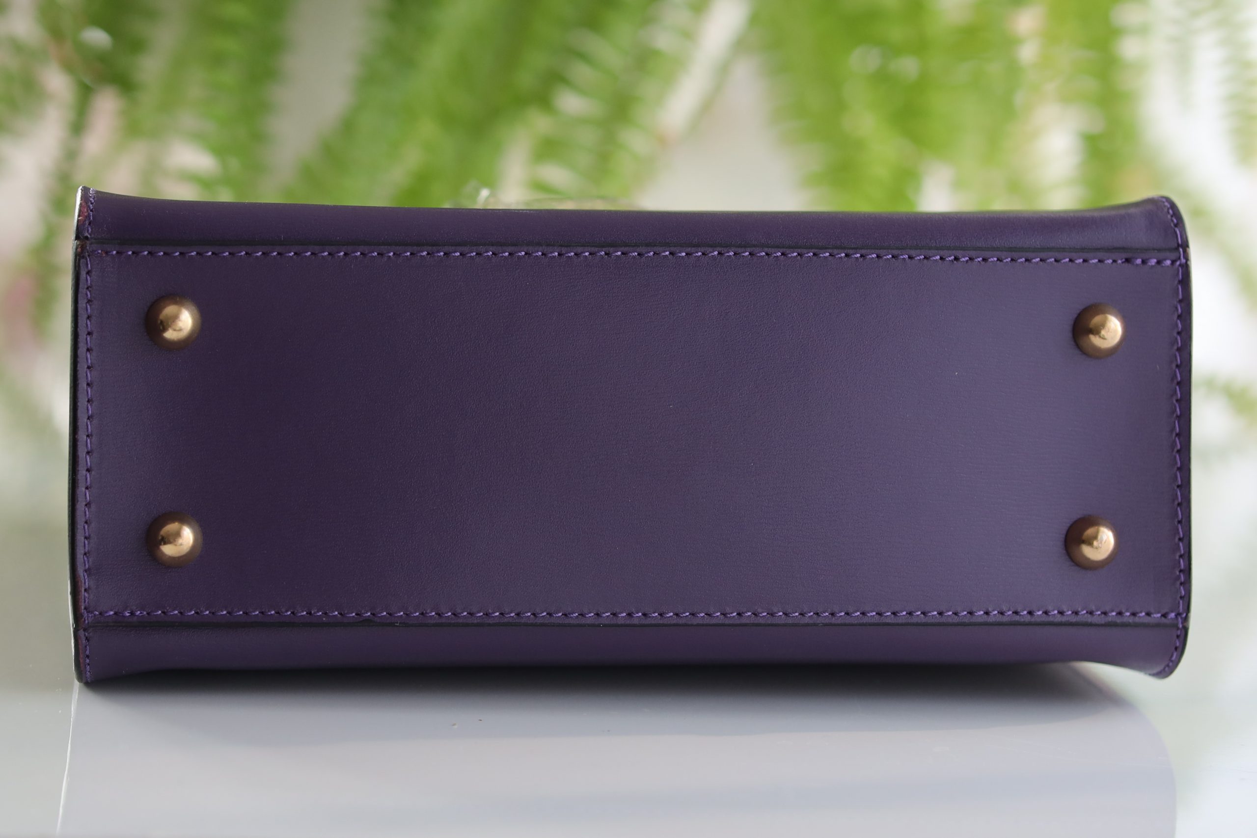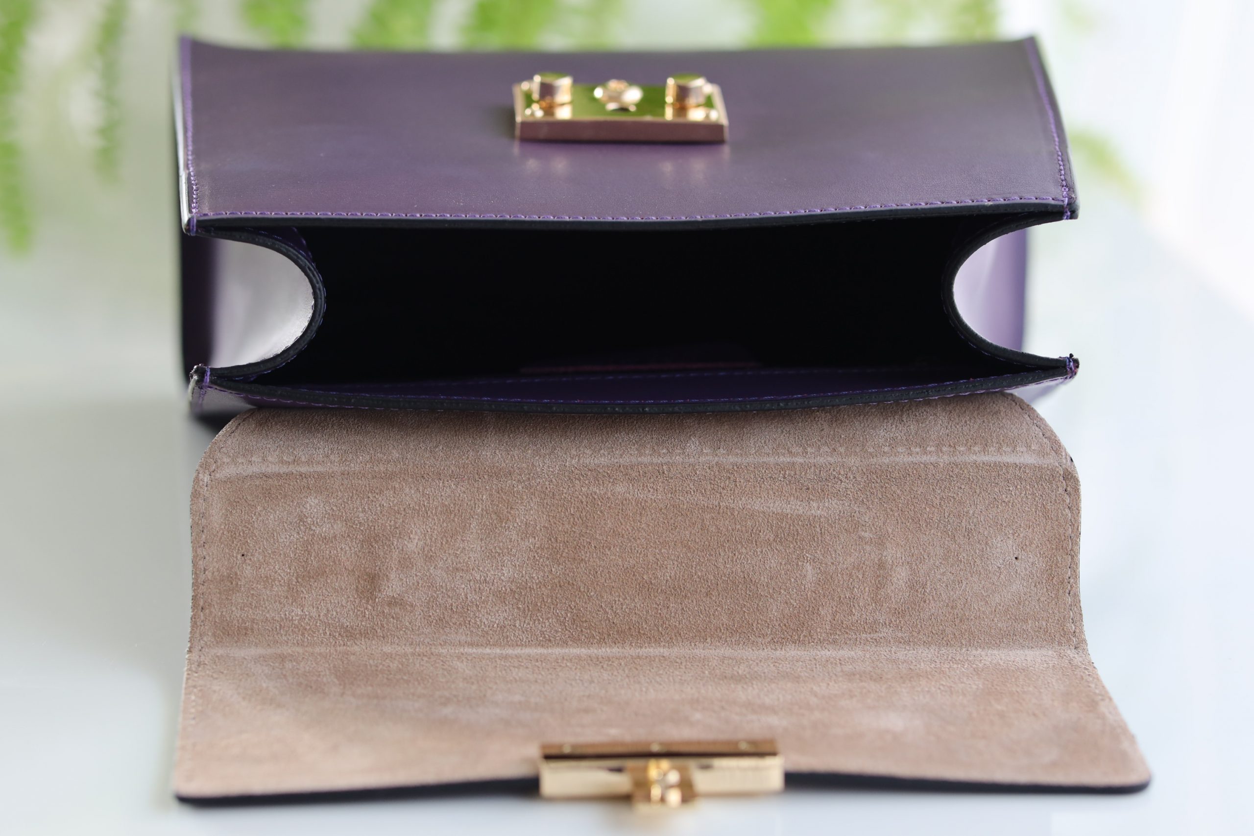 Damen Handtasche Echtleder in lila mit goldfarbenen, spiegelnden Metallverschluss.
